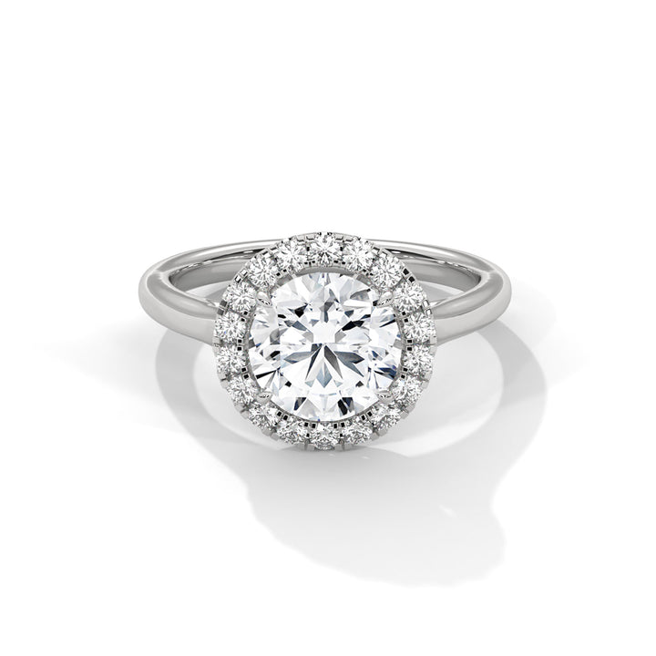 The focal point of this stunning ring is a breathtaking round brilliant cut lab-created diamond, precisely measuring approximately 8.00mm x 8.00mm and weighing an impressive 2.00 carats. Known for its exceptional fire and scintillation, this diamond radiates unparalleled brilliance from every angle. The substantial center stone is securely held in a classic 4-prong setting, designed to maximize light entry and showcase its radiant beauty. A dazzling halo of 18 shimmering round lab-created diamonds, each weighing approximately 0.018 carats, meticulously frames the round center stone, significantly enhancing its perceived size and creating a breathtaking display of light. These accent diamonds contribute an additional 0.32 carats to the ring's overall sparkle. The combined total weight for the entire ring is a remarkable 2.32 carats. Choosing lab-grown diamonds offers a sustainable and conflict-free path to luxury, allowing you to select a piece that embodies both ethical responsibility and magnificent beauty.