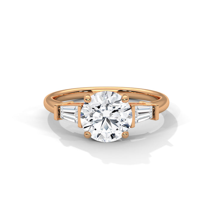 The center stone is a radiant round brilliant cut lab-created diamond, weighing 2.00 carat. Its classic shape ensures maximum brilliance and fire. Complementing the center stone are two exquisite baguette-cut lab-created diamonds, totaling 0.57 carats. Their sleek, linear shape adds a touch of modern sophistication to the ring. The combined total weight of all diamonds is 2.57 carats. The diamonds are securely set in a 10K white gold setting, which enhances their gleaming beauty. Choosing lab-grown diamonds ensures ethical sourcing and exceptional value.